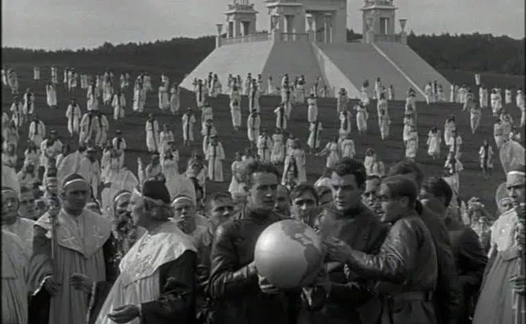 Science fiction films quickly established their place as one of the staples of the silent era. A notable early example included Denmark’s A Trip to Mars (1918), which utilized the civilization on Mars as a metaphor for what the ideal human society could be. Coming after four bitter years of a world at war, it asked: is a peaceful social order even possible? To this day, it remains perhaps the most tranquil encounter with an extraterrestrial civilization ever put to screen. The Soviet Union, in turn, looked to Mars to explore its own philosophical framework, imagining a socialist utopia under the guise of a Martian city in 1924’s Aelita.