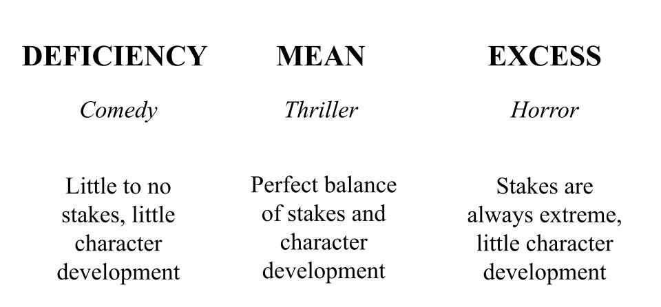Allow me to explain my own philosophy on where horror falls on the scale of important cinematic art by modeling after The Philosopher himself. Aristotle, in his Ethics, best describes virtues by first showing what they are not; in this case by their vices of excess and of deficiency.