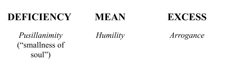 Humility, in this case, is best defined as the “golden mean” between pusillanimity, which is most easily described as a lack of self-worth, and arrogance, which is an over-inflation of one’s self-worth. Humility, then, is defined as a right estimate of one’s self: a perfect balance of knowing one’s true self worth in the eyes of God.